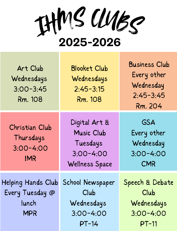 Club fair - thursday, nov. 6th, 2025 in the quad during both lunchesIHMS Student clubs 2025-26![]()